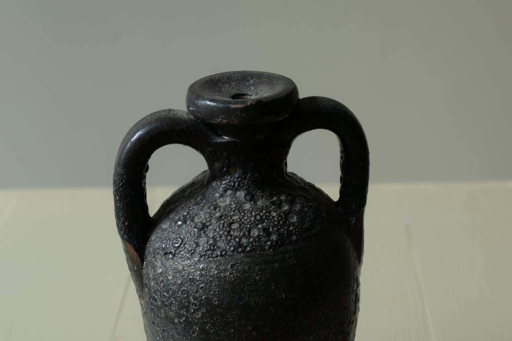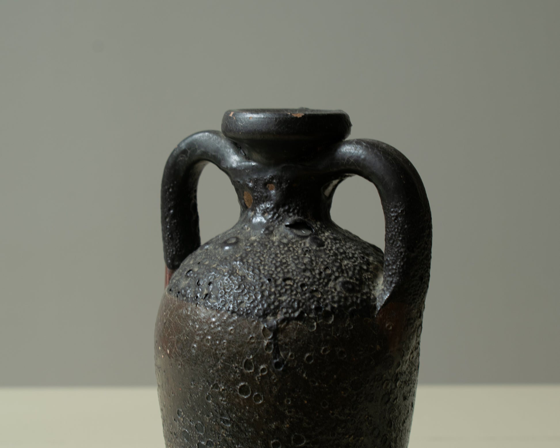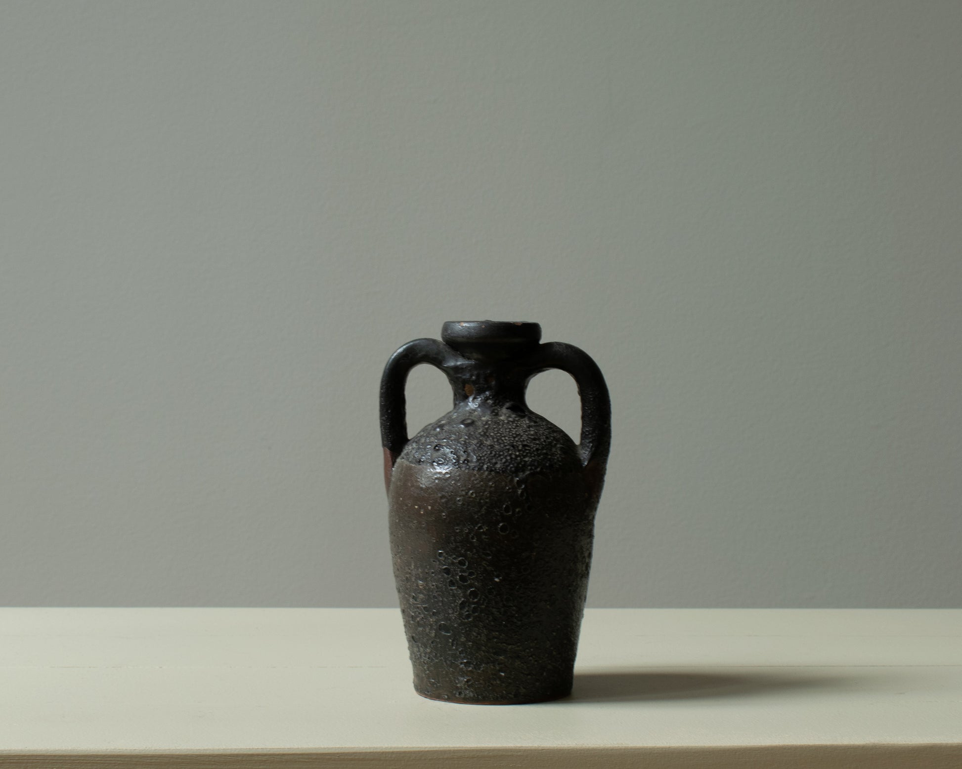 A hand-formed ceramic jug with twin loop handles and a subtly tapering body. The dark mineral glaze creates a heavily textured surface, with pitting and tonal variation that emphasize the vessel’s sculptural quality. The compact scale and narrow neck give the piece a contained, grounded presence.